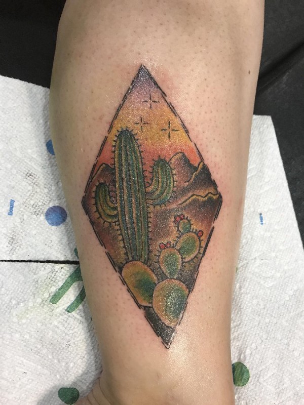 男生小腿上彩绘几何菱形和植物仙人掌纹身图片