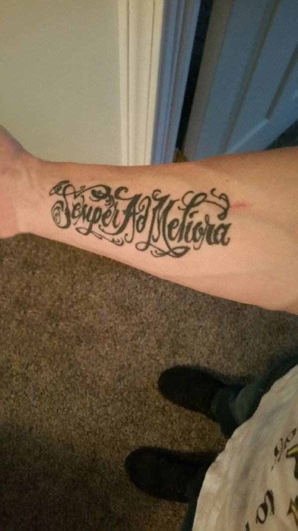 男生手臂上黑色抽象线条创意英文单词纹身图片