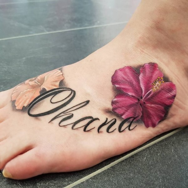 女生脚背上彩绘抽象线条英文单词和植物花朵纹身图片