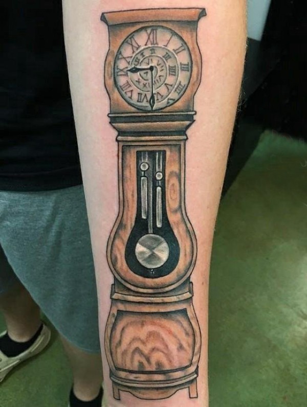 男生手臂上彩绘点刺几何线条时钟纹身图片