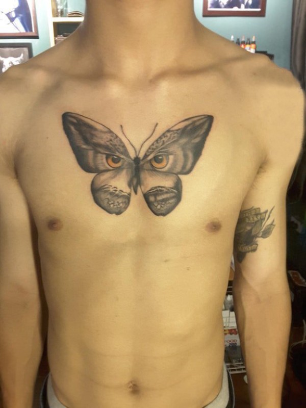 男生胸口上黑灰素描创意猫头鹰元素蝴蝶纹身图片