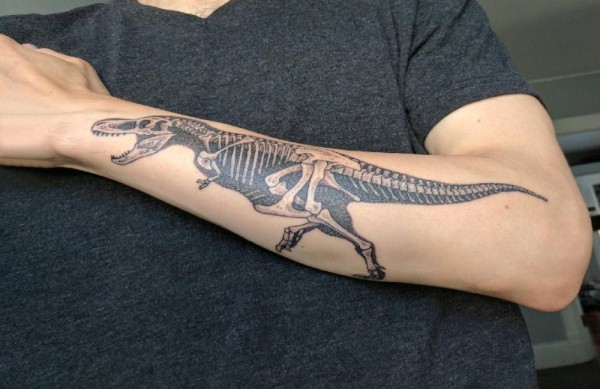 男生手臂上黑灰素描骨头恐龙纹身图片