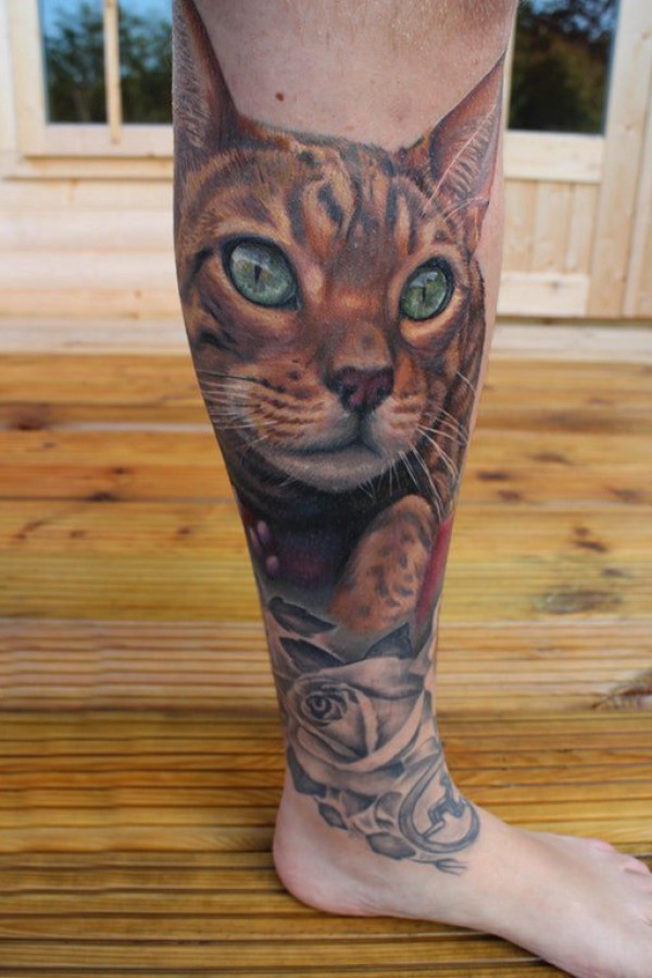 男生小腿上彩绘渐变3d写实性小动物猫咪纹身图片