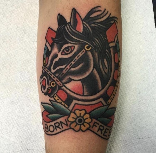 男生手臂上彩绘点刺简单线条英文植物和小动物马纹身图片