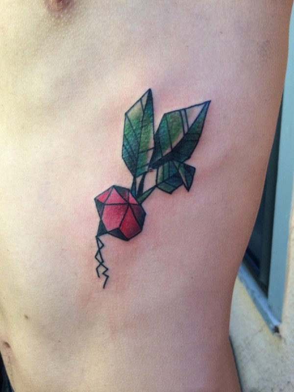 男生侧腰上彩绘渐变几何线条植物萝卜纹身图片