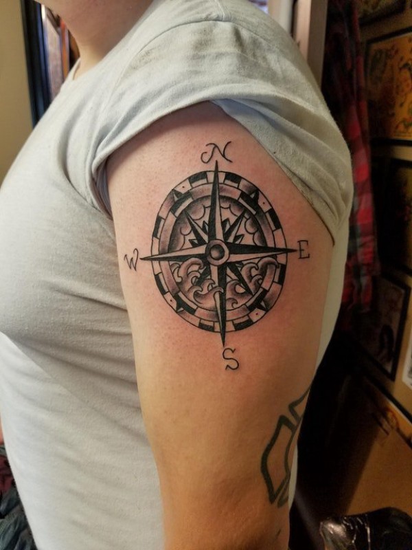 女生手臂上黑灰素描创意文艺复古指南针纹身图片