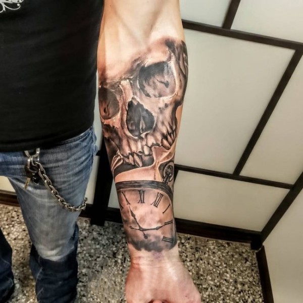 男生手臂上黑灰点刺抽象线条时钟和骷髅纹身图片