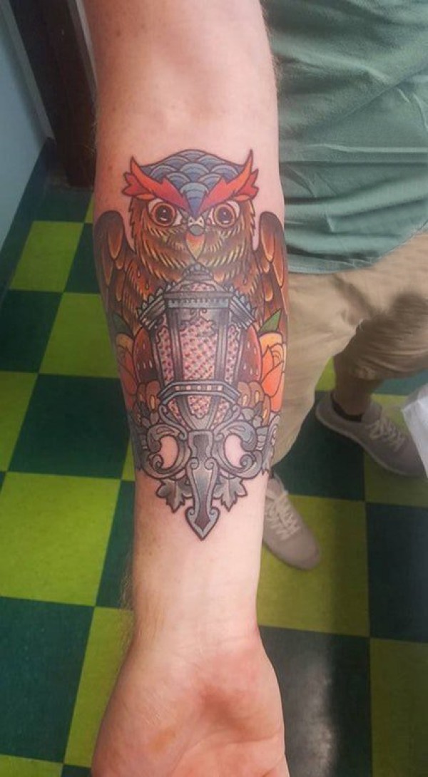 男生手臂上彩绘水彩素描创意花纹猫头鹰动物纹身图片