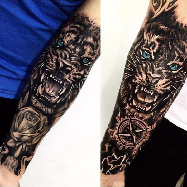 黑灰素描描绘的创意霸气的狮子头花臂纹身图片
