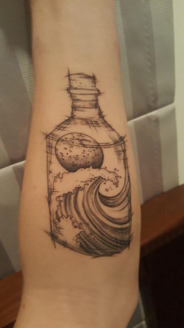 女生手臂上黑灰点刺素描几何线条瓶子和海浪纹身图片