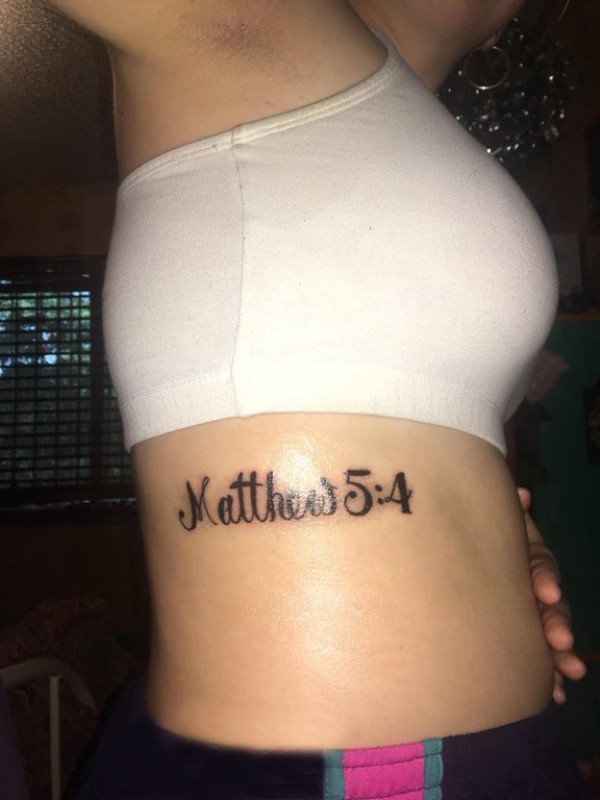女生侧腰上黑色线条文艺花体英文纹身图片