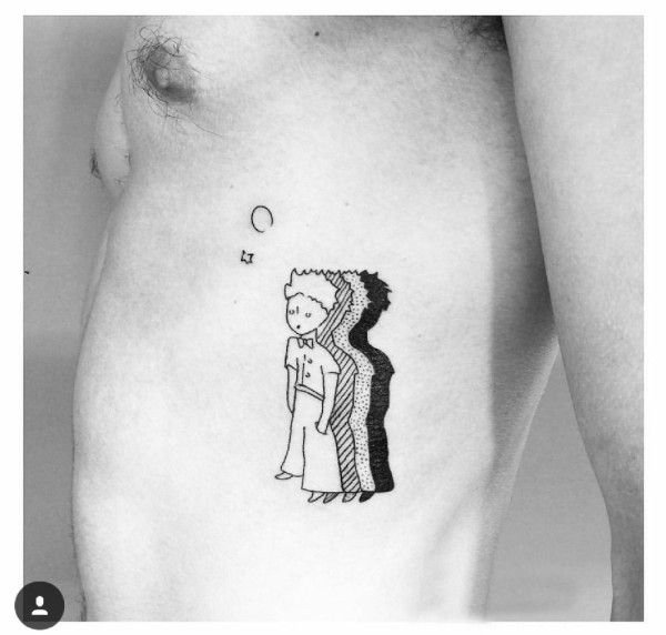 男生侧腰上黑色点刺简单线条卡通人物小王子纹身图片
