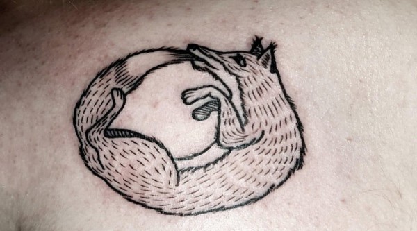 男生后肩上黑色简单线条小动物狐狸纹身图片