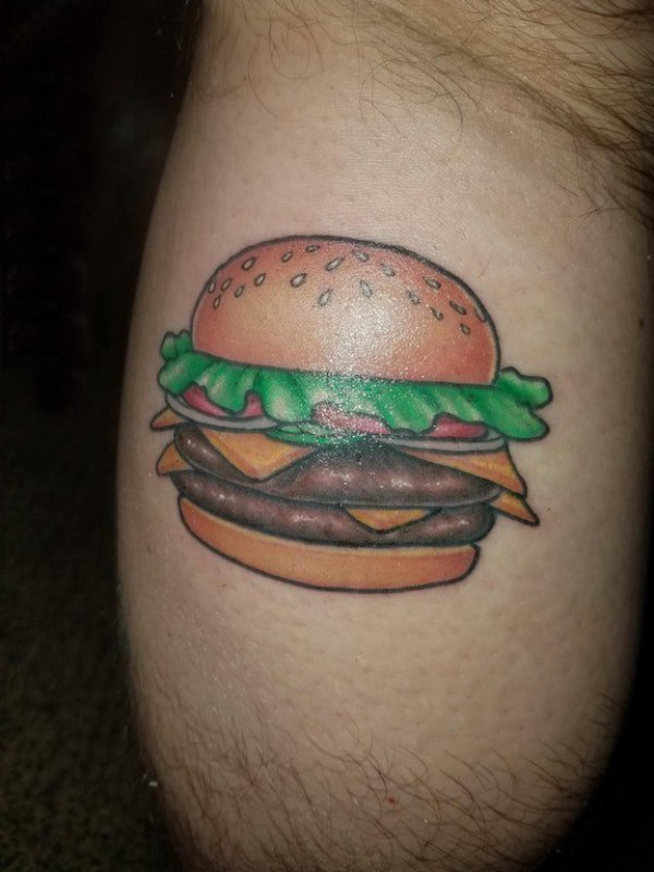 男生大腿上彩绘简单线条美味食物汉堡包纹身图片