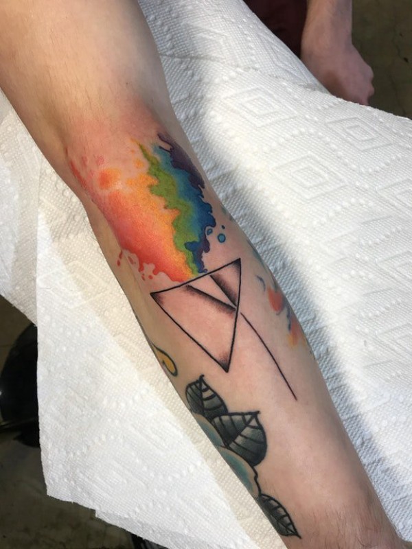 女生手臂上黑灰素描点刺技巧几何元素三角形水彩泼墨纹身图片