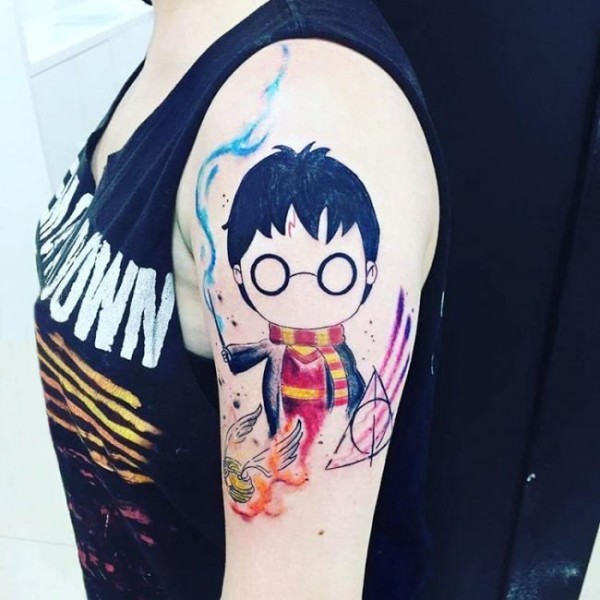 女生手臂上彩绘水彩素描创意哈利波特卡通元素纹身图片