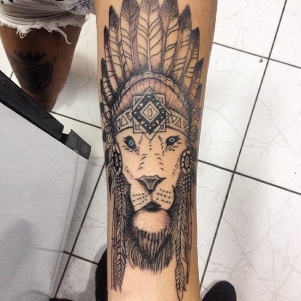 男生手臂上黑灰素描点刺技巧创意霸气印第安元素狮子头纹身图片