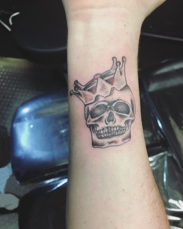 男生手臂上黑灰素描点刺技巧创意皇冠骷髅纹身图片