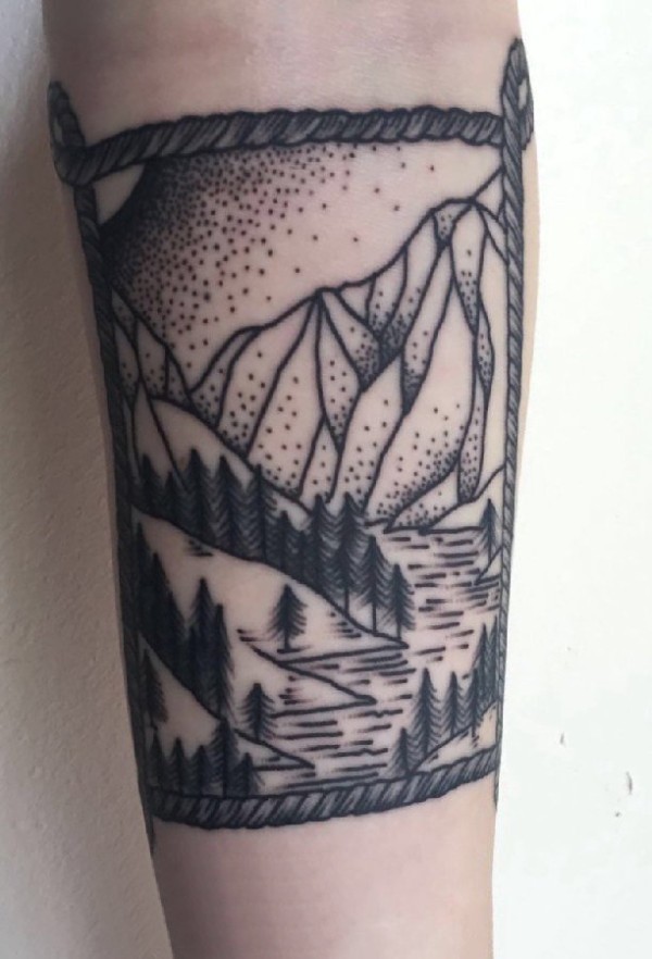 男生手臂上黑灰素描唯美简约风景纹身图片