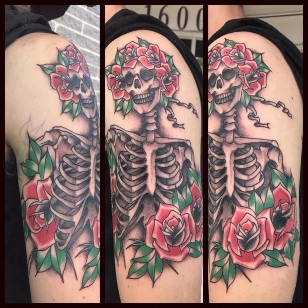 女生手臂经典潮流的骷髅与玫瑰花纹身图案