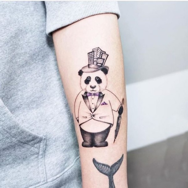 女生手臂上黑灰素描创意可爱熊猫先生纹身图片