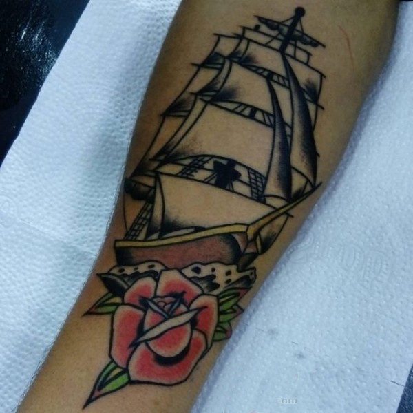 女生手臂上彩绘水彩素描创意霸气帆船纹身图片