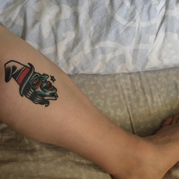 男生小腿上彩绘简单线条卡通人物魔女纹身图片