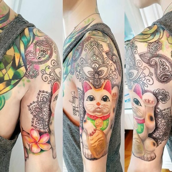 男生手臂上彩绘水彩素描创意可爱招财猫纹身图片