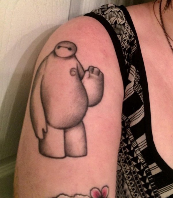 女生手臂上黑灰点刺抽象线条卡通人物大白纹身图片