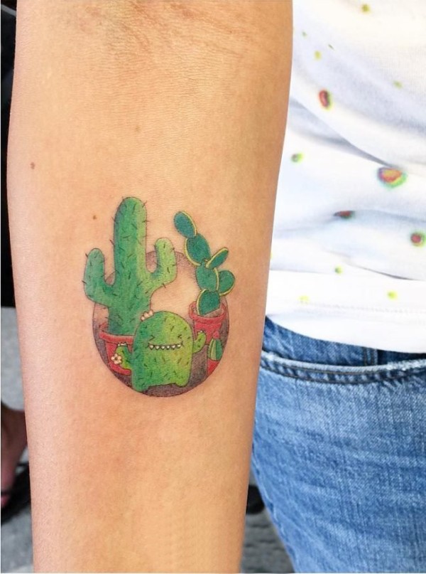 女生手臂上彩绘水彩素描创意文艺仙人掌纹身图片