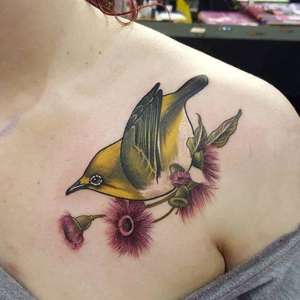 女生肩部彩绘抽象线条植物花朵和小鸟纹身图片