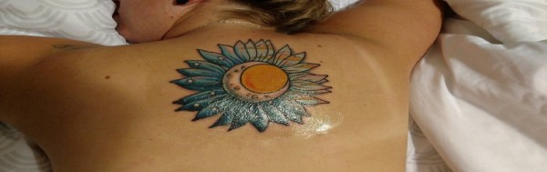 女生后背上彩绘渐变几何线条植物向日葵纹身图片