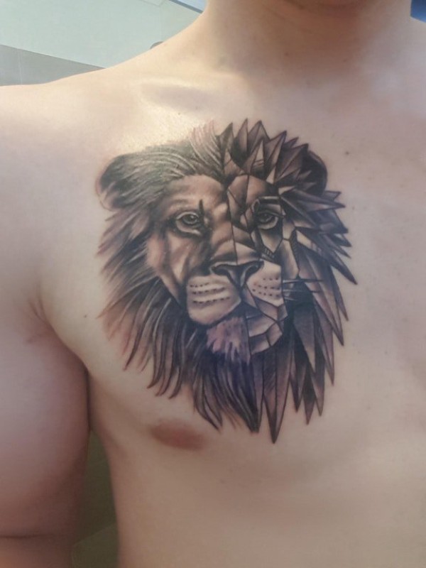 男生胸部黑灰点刺几何抽象线条小动物狮子纹身图片