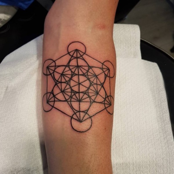 男生手臂上黑色线条素描创意几何元素纹身图片