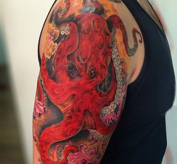 男生手臂上彩绘水彩素描创意章鱼花臂纹身图片