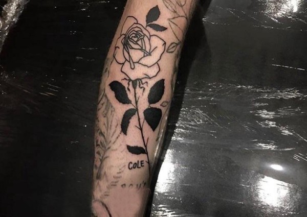 男生手臂上黑色线条文艺唯美花朵纹身图片