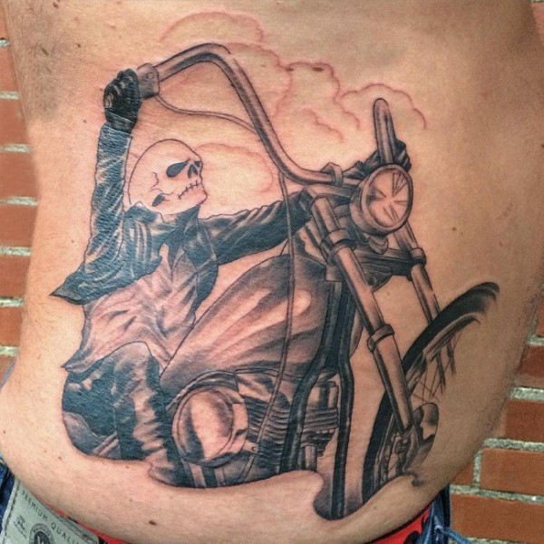 男生腹部黑灰素描点刺技巧创意霸气摩托骑手纹身图片