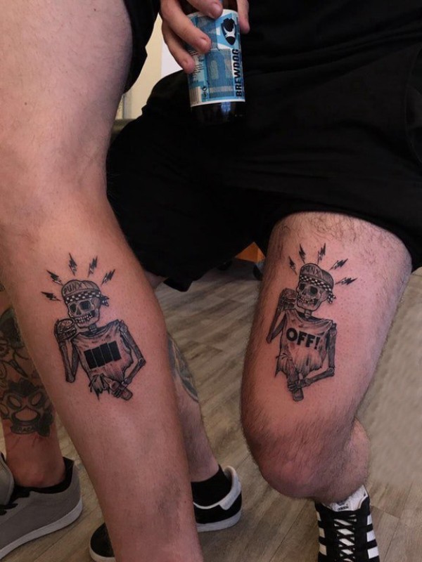兄弟腿部黑色点刺抽象线条骷髅纹身图片