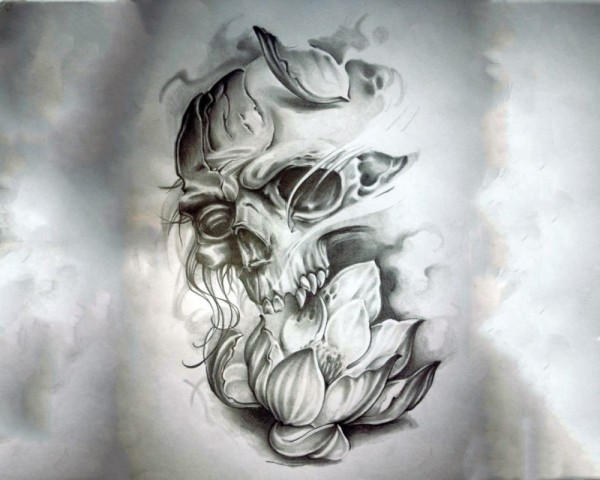 黑灰素描唯美莲花骷髅创意霸气精致纹身手稿