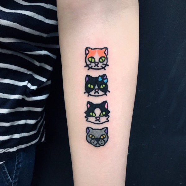 女生手臂上彩绘几何线条卡通小动物猫咪和狗纹身图片