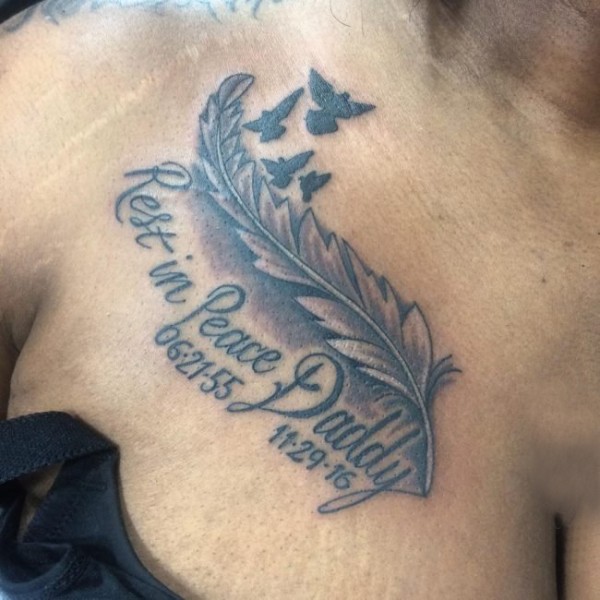 女生胸口上黑灰素描点刺技巧创意羽毛纹身图片