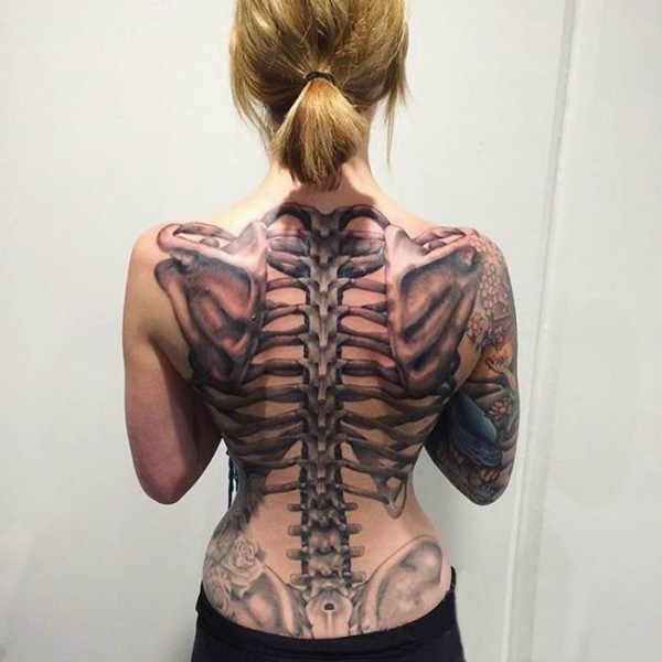 女生背部黑灰素描点刺技巧创意大面积满背骨头纹身图片