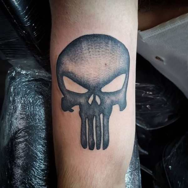 男生手臂上黑灰素描点刺技巧恐怖骷髅头纹身图片