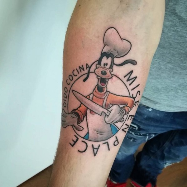 男生手臂上彩绘简单线条英文和迪士尼卡通人物纹身图片