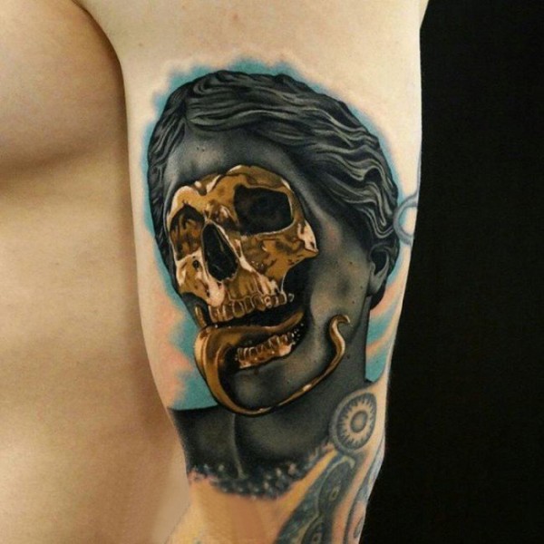 男生手臂上黑灰素描点刺技巧创意骷髅恐怖纹身图片