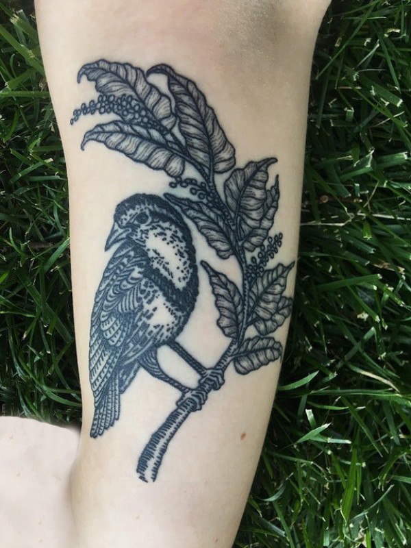 男生小腿上黑色点刺抽象线条植物和小鸟纹身图片