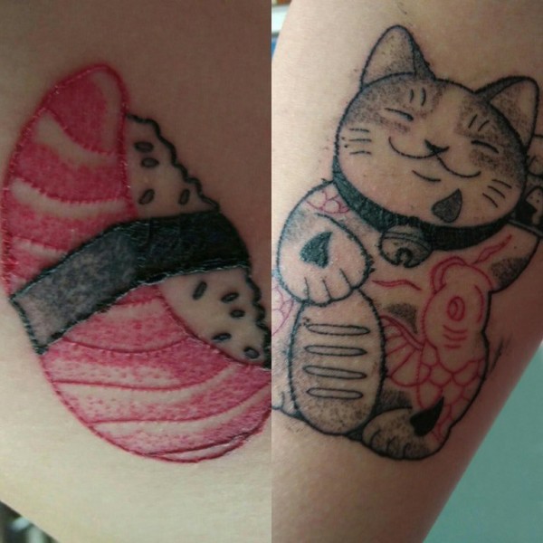 男生小腿上彩绘简单线条猫咪和寿司食物纹身图片