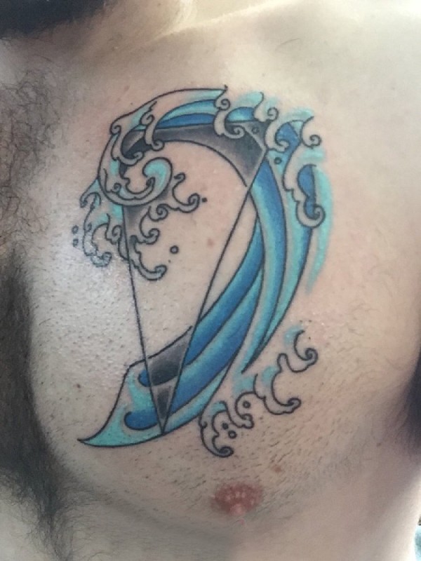 男生胸部彩绘渐变几何线条和浪花纹身图片