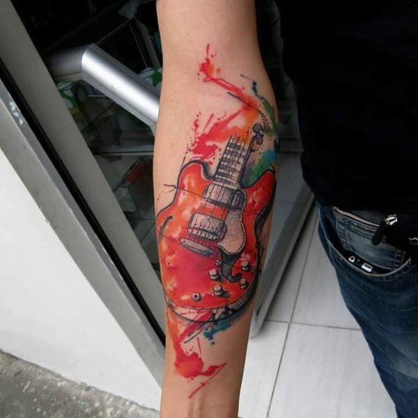 男生手臂上彩绘水彩素描创意文艺吉他纹身图片