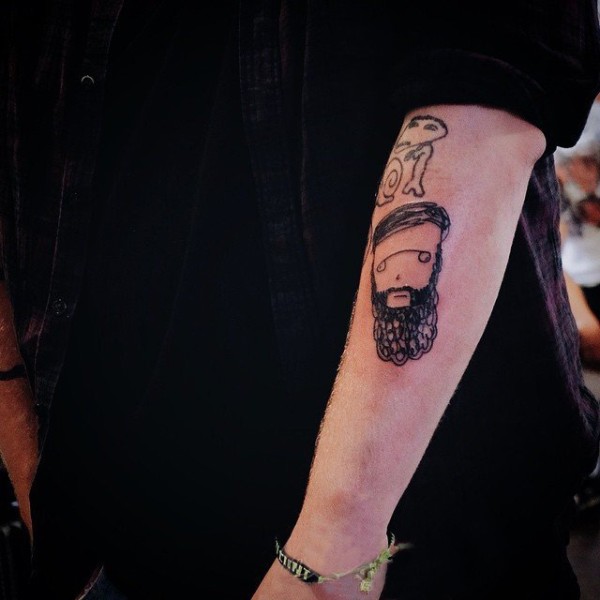 男生手臂上黑色简单抽象线条卡通人物纹身图片